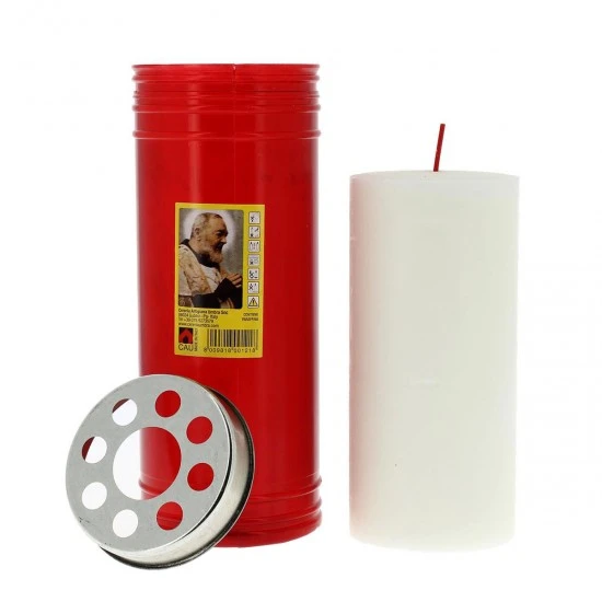 Lumino votivo in cera bianca con contenitore in plastica rosso e immagine di Padre Pio. La durata di circa 6 giorni è garantita dalla buona qualità della cera. Made in Italy