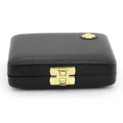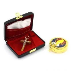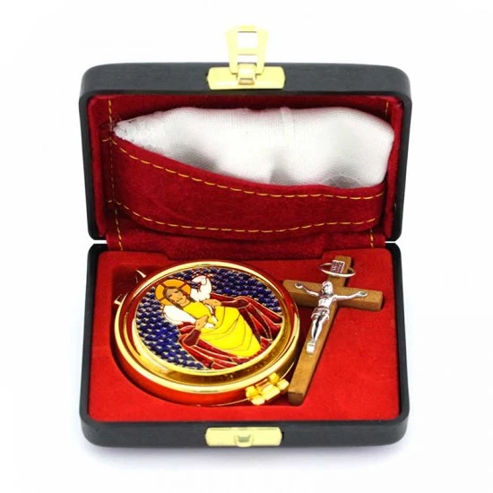 Mini Astuccio per viatico realizzato con custodia in plastica rigida nera munita di chiusura di sicurezza in metallo dorato e teca in ottone dorato con disegno smaltato. Prodotti realizzati con ottimi materiali curati nei particolari e nel rispetto della liturgia.