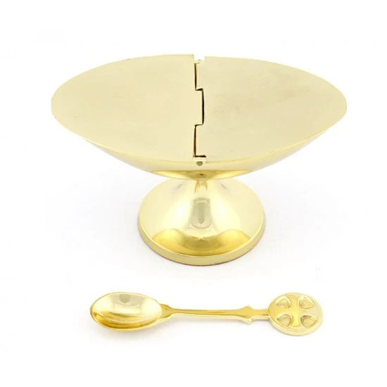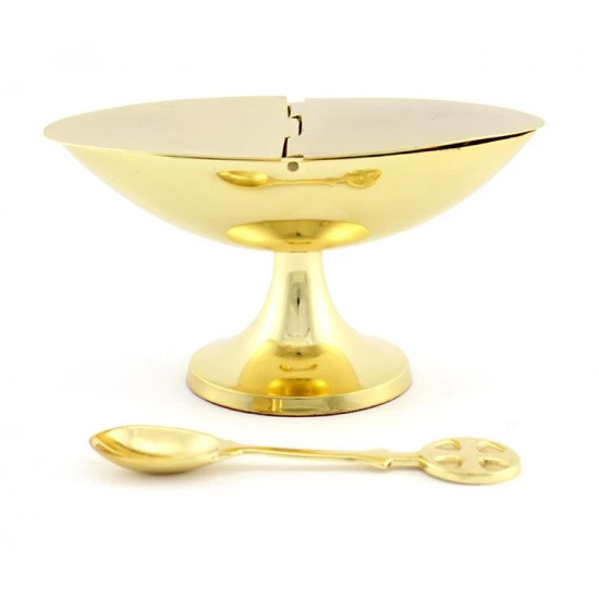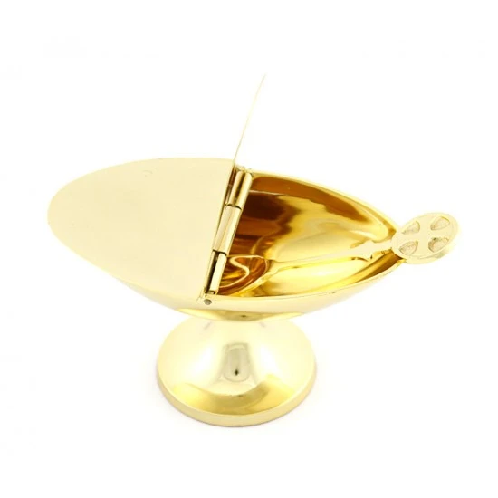 Navetta per incenso realizzata in metallo liscio dorato. Coperchio apribile lateralmente. Fornita completa di cucchiaino utile per sistemare l’incenso sul carbone.