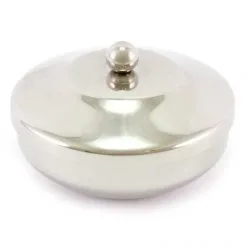 Navetta per incenso di dimensioni molto piccole adatta per spostamenti. Realizzata interamente in metallo liscio color nichelato, munita di coperchio apribile tramite piccolo pomello.
