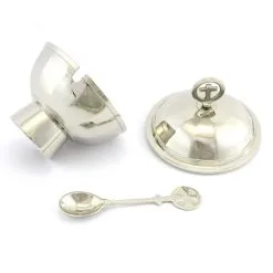 Navetta Tonda realizzata in metallo argentato liscio. Coperchio liscio apribile con piccola crocetta nel cerchio posta sopra, fornita completa di cucchiaino utile per sistemare l’incenso sul carbone.