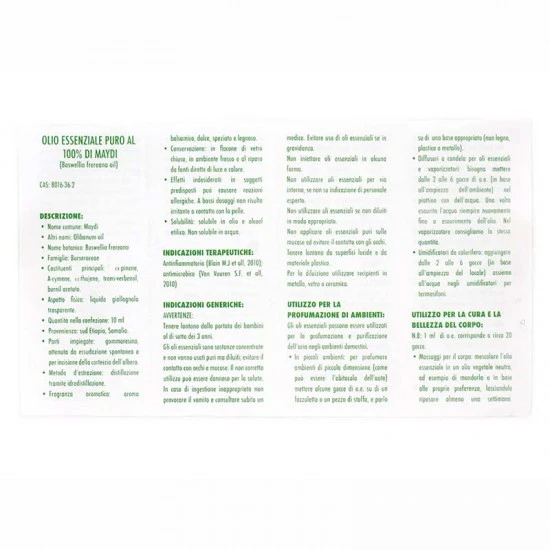 Olio essenziale naturale estratto dall’incenso, adatto per aroma terapia, per deodorare, disinfettare gli ambienti e come repellente per allontanare zanzare e insetti vari.