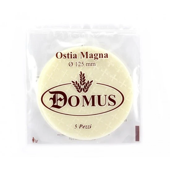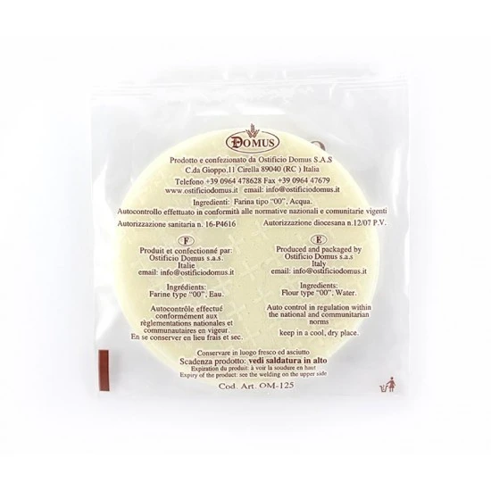 Ostia Magna di grandi dimensioni particolarmente adatta ad essere esposta all’interno della teca ostensorio. Questo prodotto della linea Domus viene realizzato secondo il rispetto delle normative vigenti in materia di lavorazione dei prodotti alimentari che sono alla base per ottenere qualità e dare sicurezza ai consumatori. Prodotta con farina di qualità tipo 00 ed acqua. Made in Italy