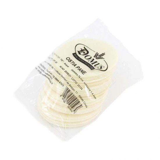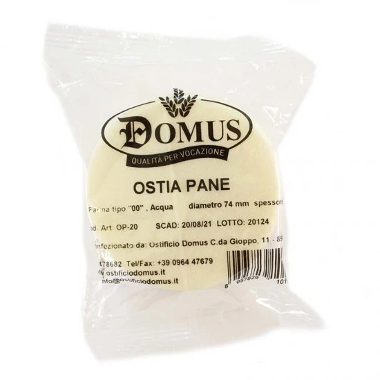 Ostia Pane per sacerdote. Prodotto della linea Domus realizzato secondo il rispetto delle normative vigenti in materia di lavorazione dei prodotti alimentari che sono alla base per ottenere qualità e dare sicurezza ai consumatori. Prodotta con farina di qualità tipo 00 ed acqua. Made in Italy