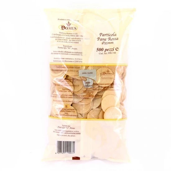 Particole Pane Rossa per la Comunione dei fedeli. Questo prodotto della linea Domus viene realizzato secondo il rispetto delle normative vigenti in materia di lavorazione dei prodotti alimentari che sono alla base per ottenere qualità e dare sicurezza ai consumatori. Made in Italy