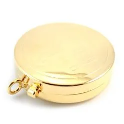 Portateca con teca IHS realizzato in similpelle nera con interno in tessuto bianco e munito di cordino. Il portateca contiene la teca di diametro 5,4 cm realizzata in metallo dorato con incisione del simbolo IHS. Made in Italy