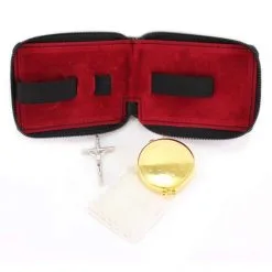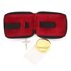 Portateca semplice realizzato in pelle nera con interno in tessuto rosso. Il portateca è munito di chiusura con zip e contiene al suo interno una teca semplice in metallo dorato di 5 cm di diametro, una piccola croce in metallo argentato e un mini purificatoio. Made in Italy