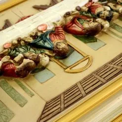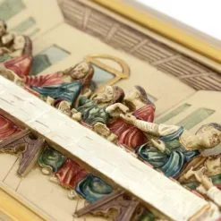 Splendida raffigurazione dell’Ultima Cena realizzata in resina colorata a rilievo e attorniata da cornice in legno. Il quadro e munito di ganci in metallo per essere appeso. Prodotto di ottima fattura e ben rifinito nei particolari fornito confezionato in scatola di cartone. Made in Italy