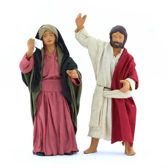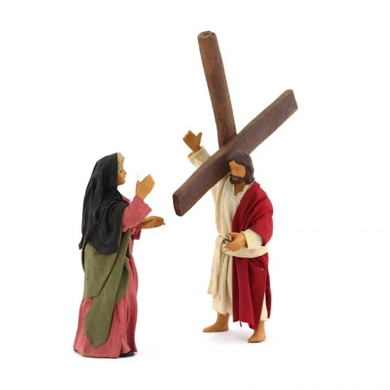 Stupenda raffigurazione di due scene della Via Crucis, l’incontro con Veronica e la Crocifissione. Statuine realizzate in vera terracotta dipinte a mano e successivamente vestite con stoffa modellata sul pezzo da esperti artigiani che curano nel dettaglio ogni minimo particolare. Made in Italy