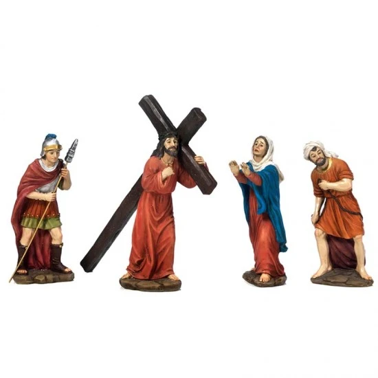 Scena passione di Cristo raffigurante la salita al Calvario, composta da 4 statuine realizzate interamente in resina colorata effetto legno. Prodotto di ottima fattura e ben rifinito nei particolari, fornito confezionato in scatola di cartone litografato.