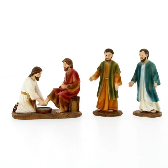 Scena vita di Gesù raffigurante la Lavanda dei piedi, composta da 3 statuine realizzate interamente in resina colorata. Prodotto di ottima fattura e ben rifinito nei particolari, fornito confezionato in scatola di cartone.