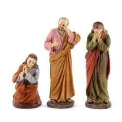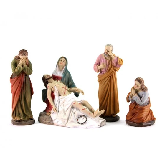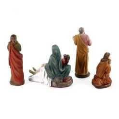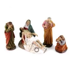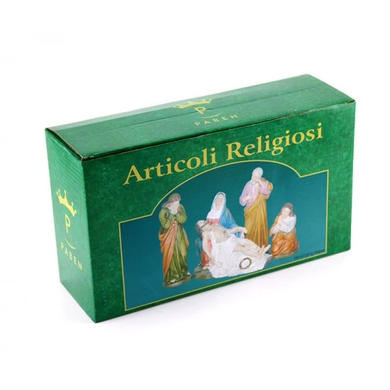 Solenne raffigurazione della morte di Gesù, composta da quattro statuine realizzate in resina colorata effetto legno. Prodotto munito di scatola litografata.