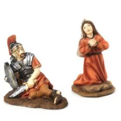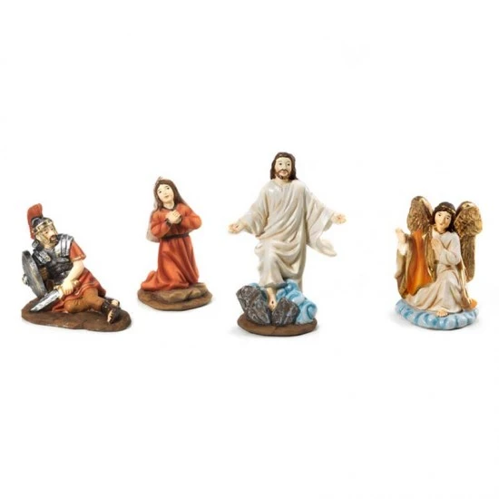 Scena raffigurante la Resurrezione di Gesù, composta da 4 statuine realizzate interamente in resina colorata effetto legno. Prodotto di ottima fattura e ben rifinito nei particolari, fornito confezionato in scatola di cartone.