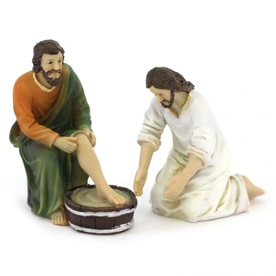 Scena vita di Gesù la Lavanda dei piedi, realizzata interamente in resina colorata. Prodotto di ottima fattura e ben rifinito, fornito confezionato in scatola di cartone.