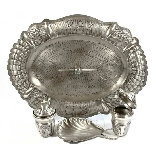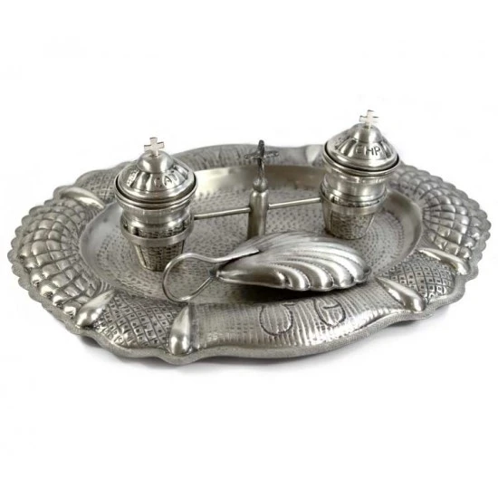 Servizio da battesimo realizzato in ottone argentato ossidato con piattino ovale rifinito con fregi e scritta Pax, lavorato con la tecnica del cesello a mano. Completo di vasetti e conchiglia. Made in Italy