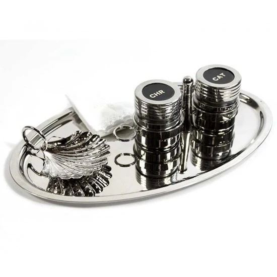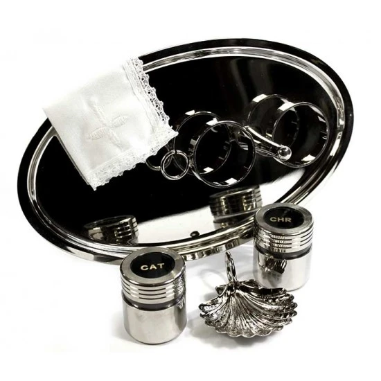Servizio da battesimo realizzato in metallo argentato lucido. Il piattino ovale è liscio ed include i vasetti, la conchiglia e il manuterge. Made in Italy