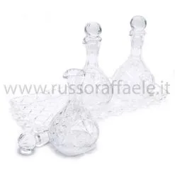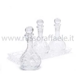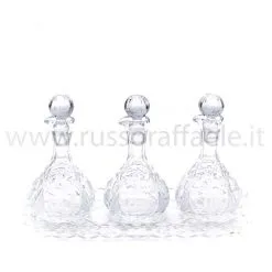 Servizio di olii santi (Infermi, Chrisma e Catecumeni) realizzato in cristallo di bohemia molato. I tappi delle ampolle sono ad incastro sicuro. Piattino rettangolare con lavorazione analoga. Viene spedito in una scatola molto elegante di colore rosso rubino. Ideale per un regalo.