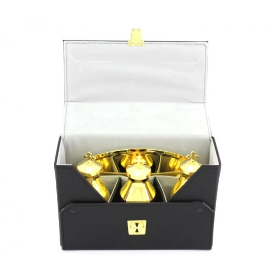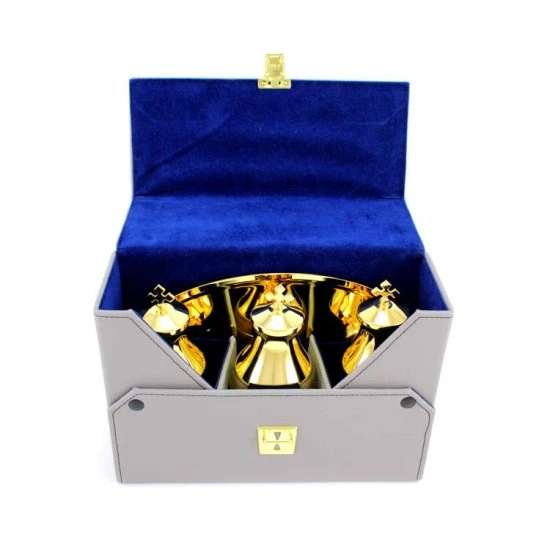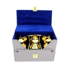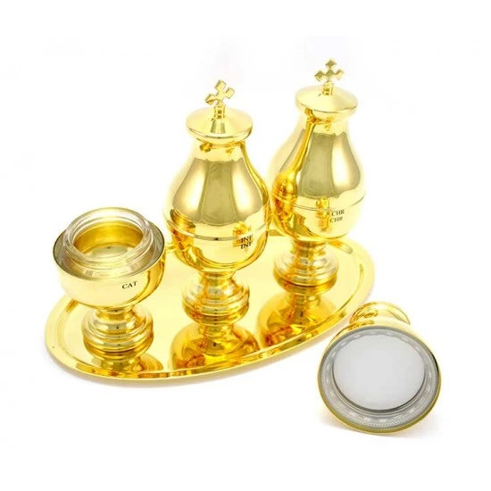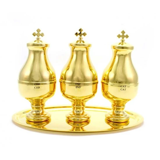Servizio per oli Santi (catecumeni, crisma, infermi) realizzato in ottone liscio dorato, completo di vassoio con ferma vasetti. I tre vasetti sono muniti di interno in vetro. Il prodotto è fornito completo di astuccio. Made in Italy