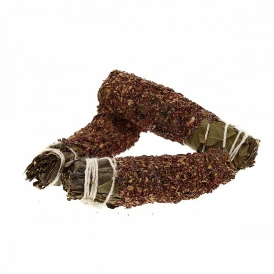 Smudge artigianale realizzato a mano con erbe aromatiche, resine naturali, leganti naturali e olii essenziali. Al centro è composto da rametti di cedro, alloro ed eucalipto.