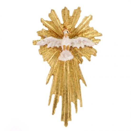 Spirito Santo realizzato interamente in legno di acero naturale e dipinto a mano con colori ad olio, impreziosito da una splendida raggiera con coda ben rifinita con falsa foglia oro brillante. Quest’opera di pregevole fattura artigianale viene lavorata in un piccolo laboratorio dalla grande esperienza per le sculture sacre. Made in Italy