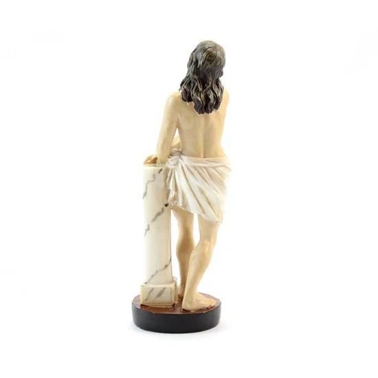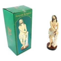Statua Cristo alla colonna, raffigurazione di Gesù legato alla colonna prima della flagellazione. Viene realizzata in resina colorata effetto legno e completa di elegante scatola litografata.