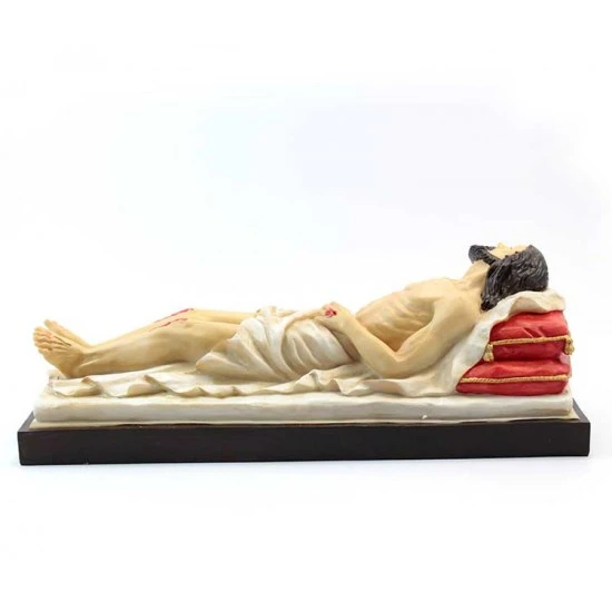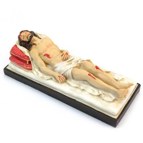 Statua Gesù morto che giace sul lenzuolo in resina colorata effetto legno completa di elegante scatola litografata.