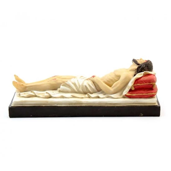 Statua Gesù Morto che giace sul lenzuolo, realizzata in resina colorata effetto legno completa di elegante scatola litografata.