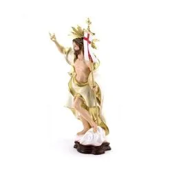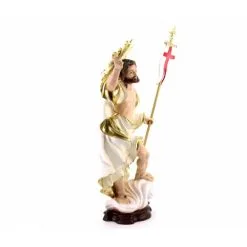 Statua Gesù Risorto con aureola e bandiera in mano, realizzata in resina piena e dipinta a mano con colori indelebili. Produzione artigianale eseguita in un piccolo laboratorio dalla grande esperienza nella lavorazione di tutte le sculture sacre, questi artigiani curano ogni pezzo con la massima attenzione cura per i particolari al fine di rendere ogni opera unica ed originale. Made in Italy