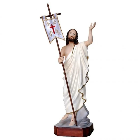 Statua Gesù Risorto con bandiera, realizzata interamente in resina dipinta a mano con colori indelebili. Produzione artigianale eseguita in un piccolo laboratorio dalla grande esperienza nella lavorazione di tutte le sculture sacre, questi artigiani curano ogni pezzo con la massima attenzione cura per i particolari al fine di rendere ogni opera unica ed originale. Made in Italy