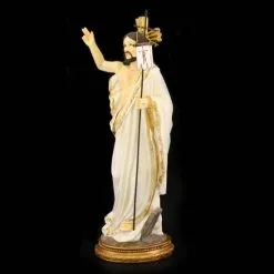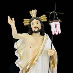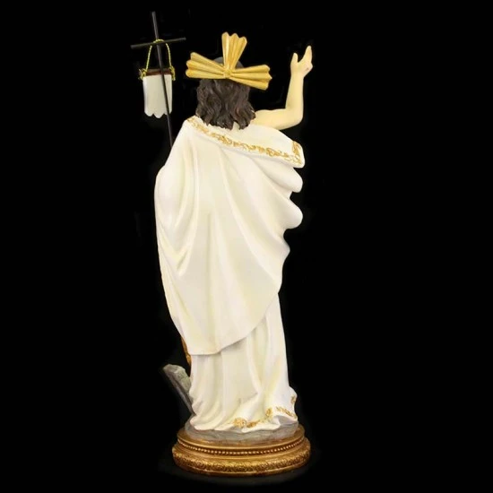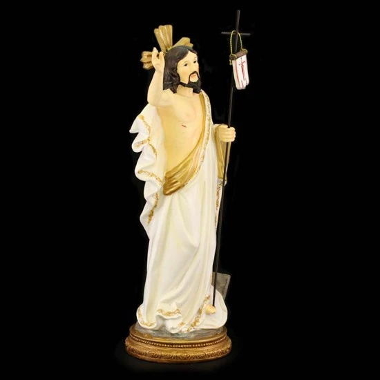 Statua Gesù Risorto realizzata interamente in resina colorata. Prodotto di ottima fattura e ben rifinito confezionato in scatola di cartone rigido.