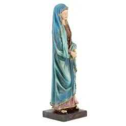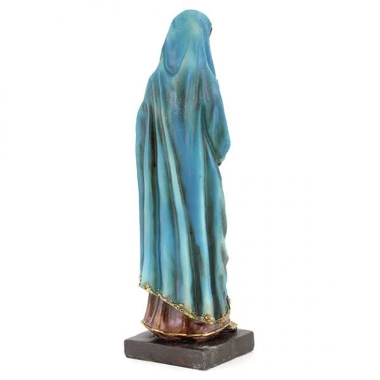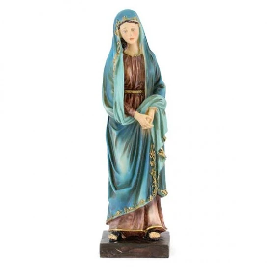 Statua Madonna Addolorata realizzata in resina colorata effetto legno. Confezionata in scatola di cartone litografato.