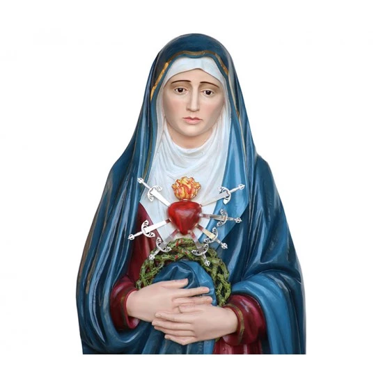 Statua Madonna Addolorata realizzata interamente in vetroresina e dipinta a mano con colori indelebili. Produzione artigianale eseguita in un piccolo laboratorio dalla grande esperienza nella lavorazione di tutte le sculture sacre, questi artigiani curano ogni pezzo con la massima attenzione e cura per i particolari al fine di rendere ogni opera unica ed originale. Made in Italy