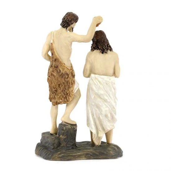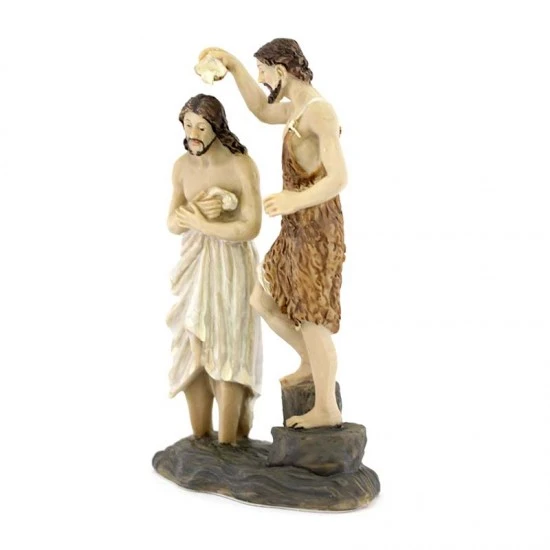 Statua scena raffigurante il battesimo di Gesù con San Giovanni Battista, realizzata interamente in resina colorata effetto legno. Prodotto di ottima fattura e ben rifinito, fornito confezionato in scatola di cartone.
