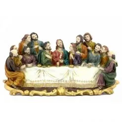 Statua Ultima Cena è il nome con il quale nella religione cristiana si indica solitamente la cena di Gesù con gli apostoli durante la Pasqua ebraica precedente la sua morte. Si tenne nel luogo detto del Cenacolo. Questa raffigurazione è realizzata in resina colorata effetto legno e si può sia poggiare che appendere a parete, avendo in dotazione un gancio sul retro.Completa di elegante scatola litografata.