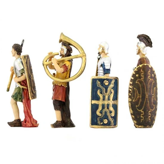 Statuine di quattro soldati romani realizzate interamente in resina colorata effetto legno. Prodotto di ottima fattura e ben rifinito, fornito confezionato in scatola di cartone.