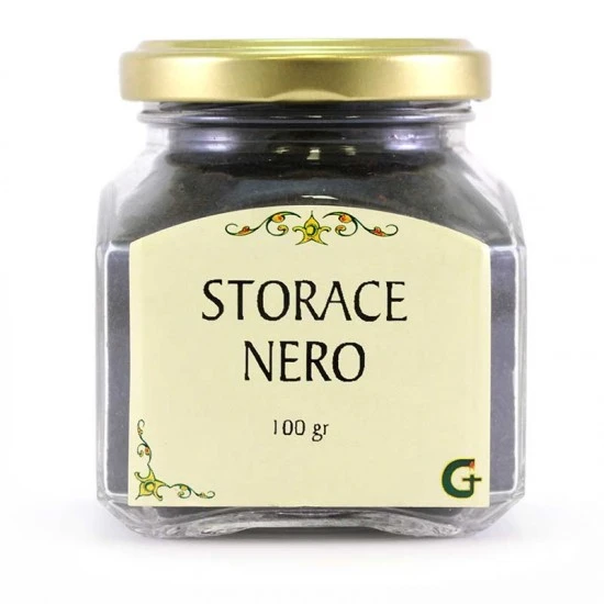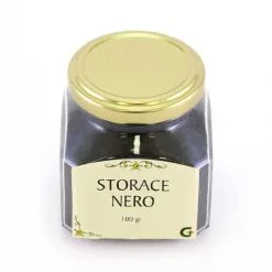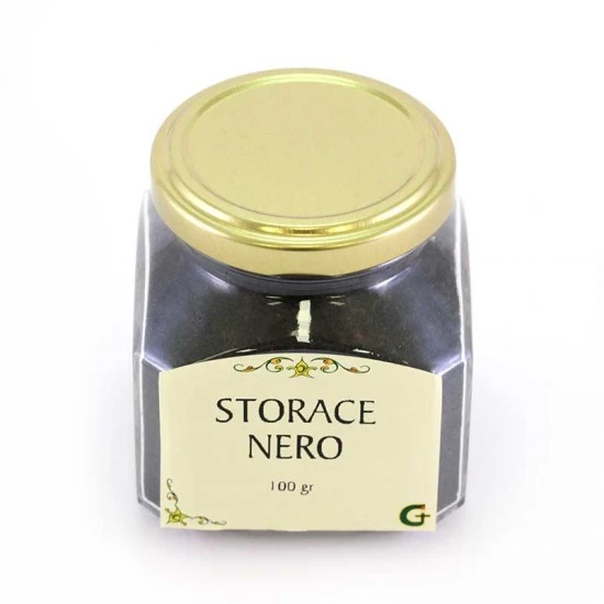 Incenso Storace nero, questa resina molto ricercata ha una profumazione intensa e balsamica, granuloso e dolce come la cannella. Confezionato in barattolo di vetro utile per preservare il prodotto dall’umidità.