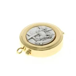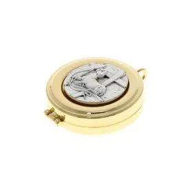 Teca eucaristica realizzata in metallo dorato con chiusura ad incastro e placca in peltro raffigurante simbolo eucaristico Agnello a rilievo. La teca è munita di anello per poterla indossare al collo. Made in Italy