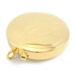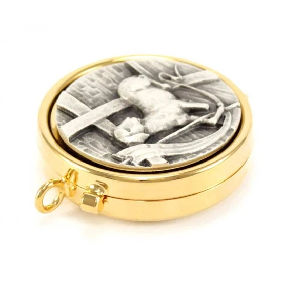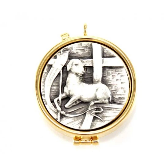 Teca eucaristica realizzata in metallo dorato con chiusura ad incastro. La placca argentata raffigura la simbologia liturgica dell’ Agnello con Croce. Made in Italy