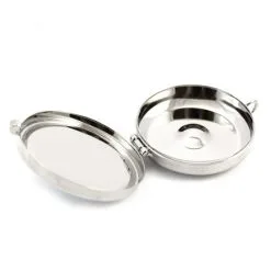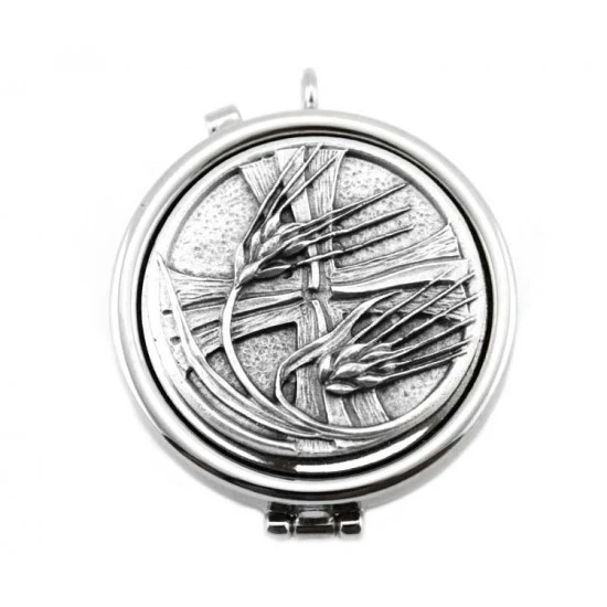 Teca eucaristica in metallo argentato con placca in peltro raffigurante una croce con le spighe. Il colore della teca è argentato perchè vi vanno riposte le particole per celiaci. Made in Italy