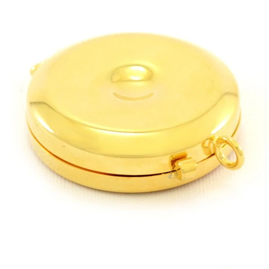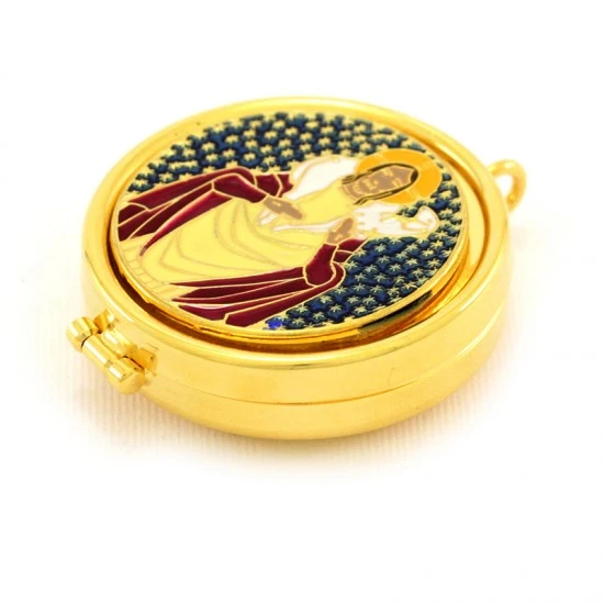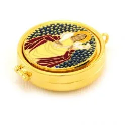 Teca eucaristica realizzata interamente in metallo dorato con chiusura ad incastro, impreziosita dalla placca smaltata e colorata con immagine raffigurante Gesù Buon Pastore. Made in Italy