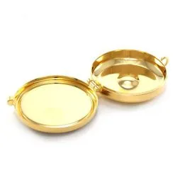 Teca eucaristica realizzata in metallo dorato con chiusura ad incastro. La placca smaltata raffigura la simbologia del calice tra le mani. Made in Italy