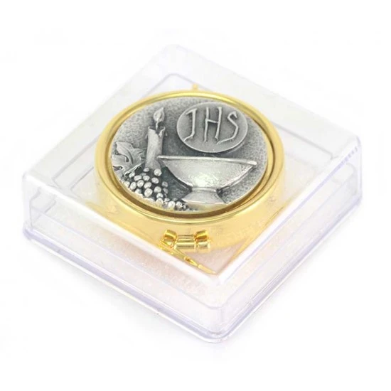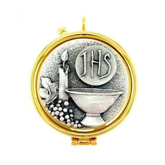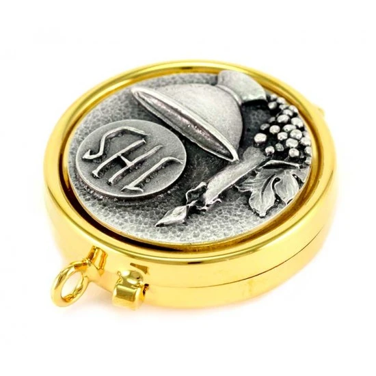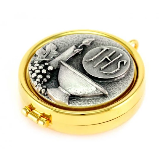 Teca eucaristica realizzata in metallo dorato con chiusura ad incastro. La placca argentata raffigura la simbologia liturgica del calice, l’uva e il cero. Made in Italy