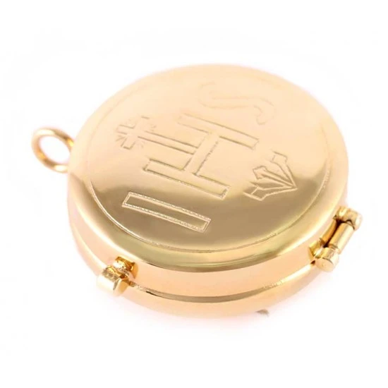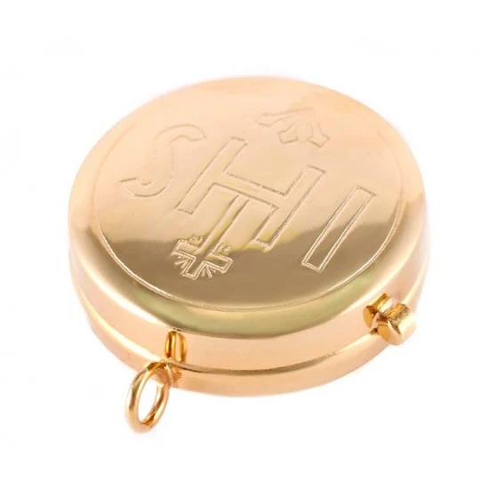 Teca eucaristica in metallo dorato con incisione sul coperchio della simbologia liturgica IHS.