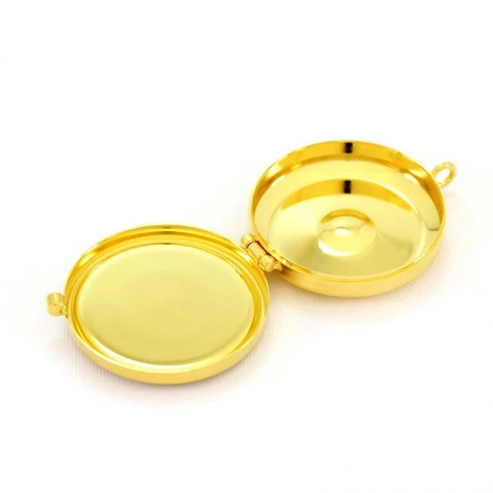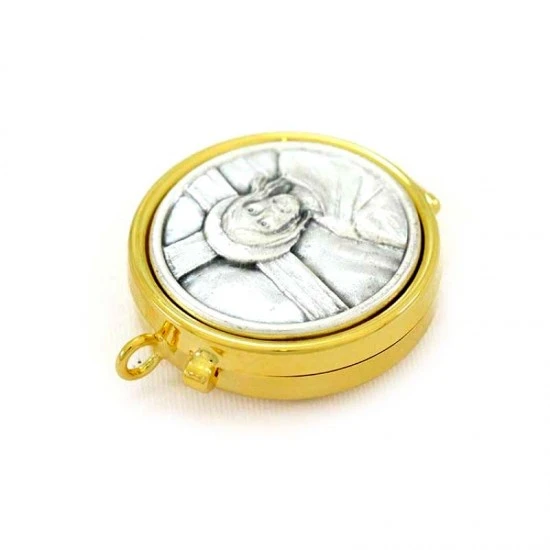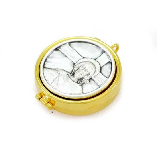 Teca eucaristica realizzata in metallo dorato con placca argentata raffigurante Ecce Homo e chiusura ad incastro. Made in Italy