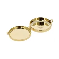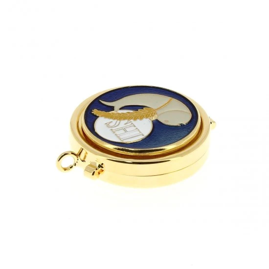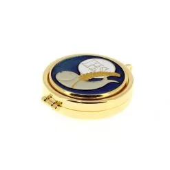 Teca eucaristica realizzata interamente in metallo dorato con chiusura ad incastro, impreziosita dalla placca smaltata e colorata raffigurante i simboli IHS e Pesce. Made in Italy