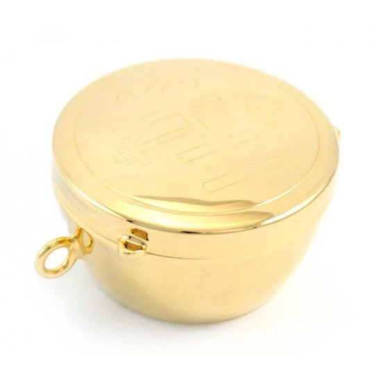 Teca eucaristica Alta in metallo dorato con incisione sul coperchio della simbologia liturgica dell’ Ihs. Made in Italy