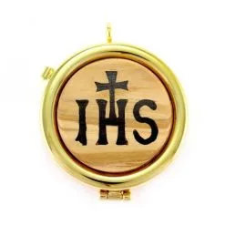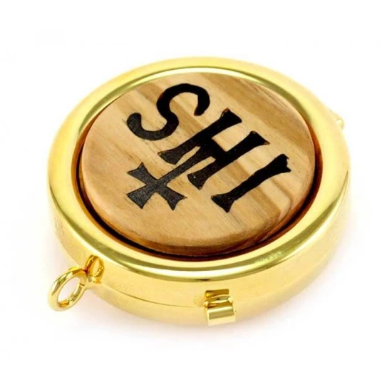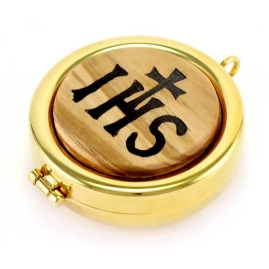 Teca eucaristica realizzata interamente in ottone dorato con placca in legno di ulivo e chiusura ad incastro. Sulla placca in legno è raffigurata la scritta IHS. Made in Italy
