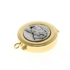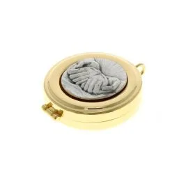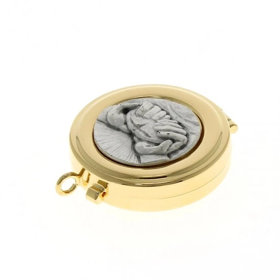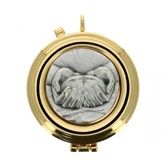 Teca eucaristica realizzata in metallo dorato con chiusura ad incastro e placca in peltro raffigurante simbolo eucaristici Mani e Pane a rilievo. La teca è munita di anello per poterla indossare al collo. Made in Italy