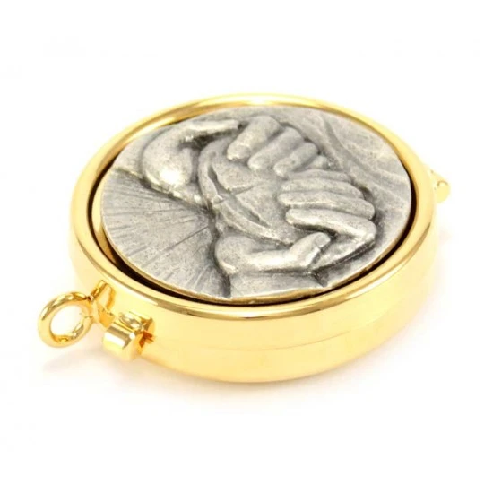 Teca eucaristica realizzata in metallo dorato con chiusura ad incastro. La placca argentata raffigura la simbologia liturgica del pane tra le mani. Made in Italy