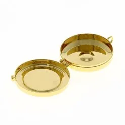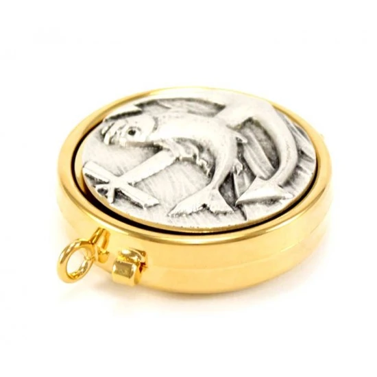 Teca eucaristica realizzata in metallo dorato con chiusura ad incastro. La placca argentata raffigura la simbologia liturgica del pesce con Croce. Made in Italy